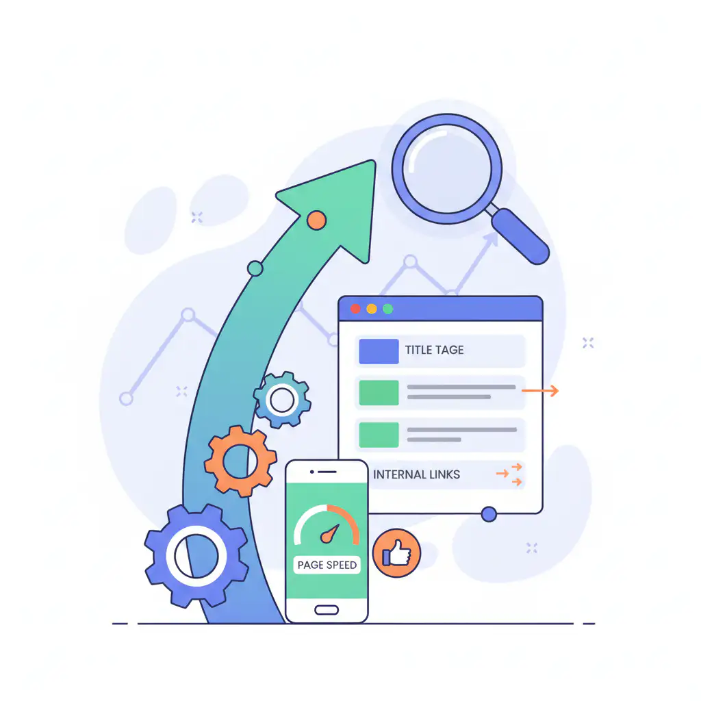 Key factors include optimized meta tags, headings, content structure, internal linking, and page speed.